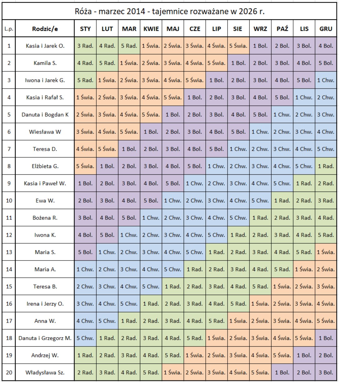 1 marca 2014r. rozpoczęliśmy modlitwę za dzieci. Wybraliśmy też Świętą Rodzinę, by patronowała naszej Róży. Podczas Wieczoru Chwały 27 marca 2014r. uroczyście zawierzyliśmy naszą modlitwę rodzicielską Matce Bożej i całej Świętej Rodzinie.